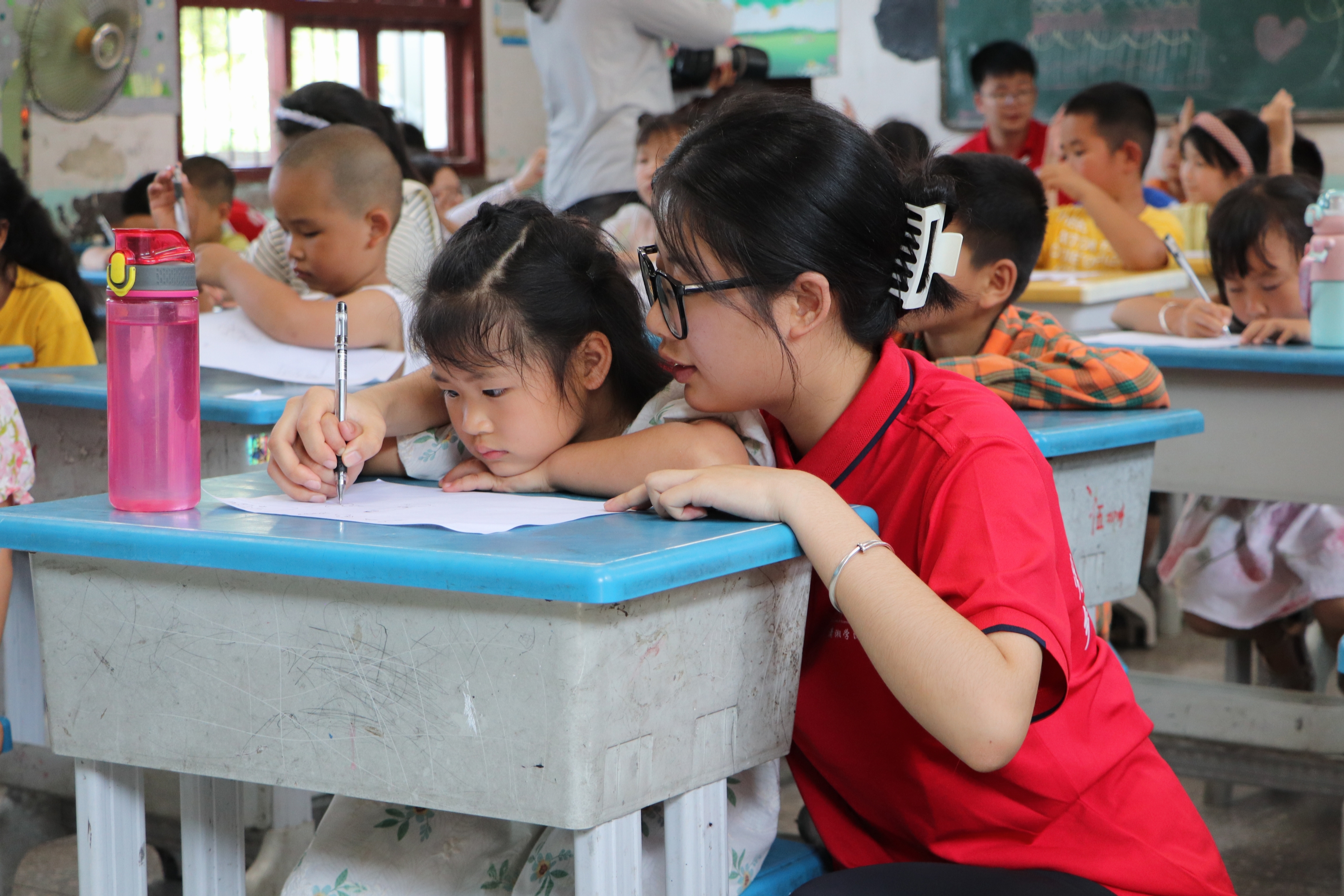 图 学生在志愿者们的帮助下制作国防手抄报