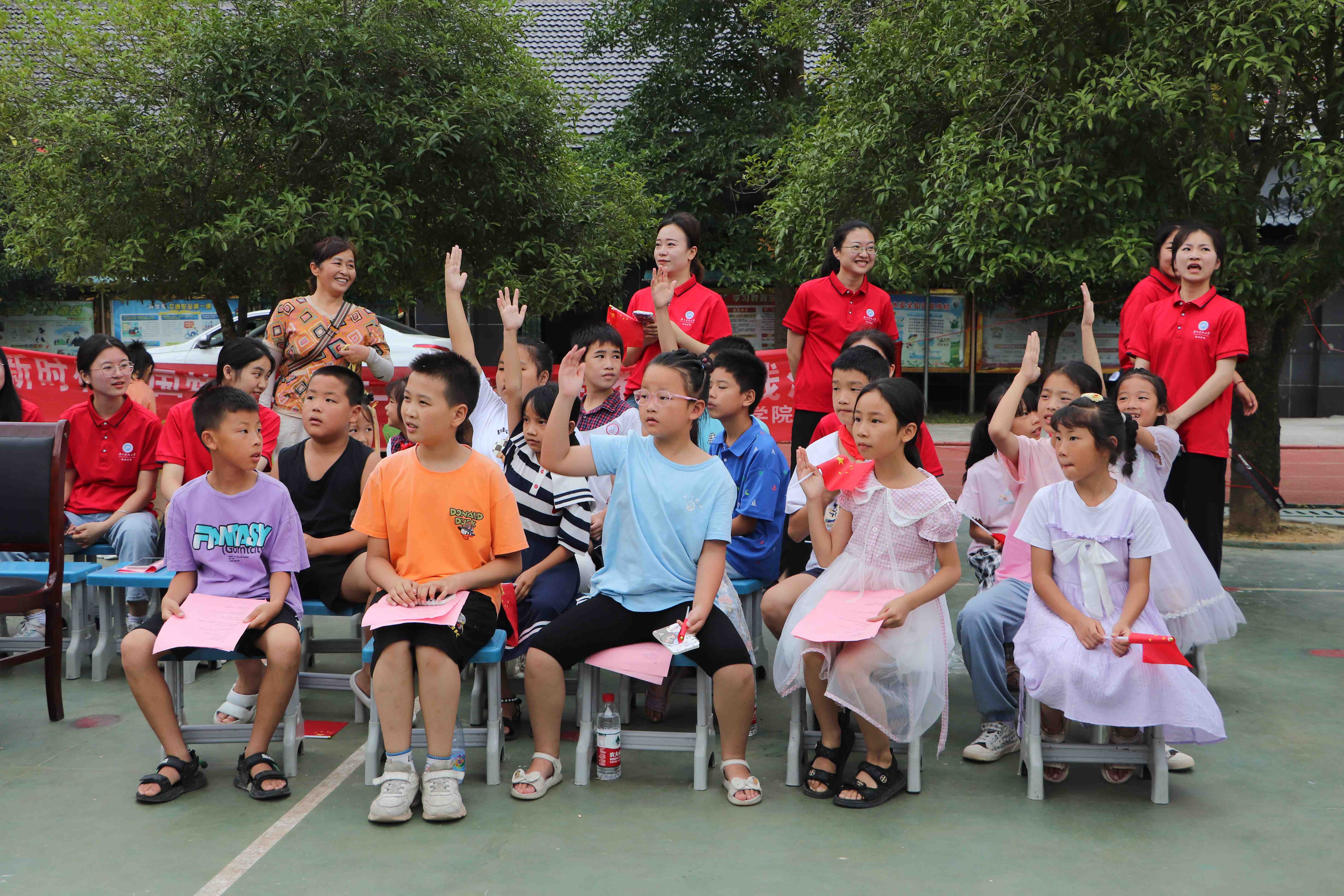 红色文艺暖童心,初心不改致未来。由实践团队全体成员和木脚村学生合唱《我和我的祖国》,学生们铿锵领唱,稚嫩的童声里充满着自信与力量,浓浓的爱国之情仿佛从小小的心里喷涌而出,在歌曲的交响声中学生们的少年豪情被彻底点燃。我们与祖国血脉相连,一刻也不能分离,在时代的浪潮中,在强国路上,每一个人也都应该追星逐月,迎接新一轮旭日黎明的颜色。由退伍先锋队、实践团队部分队员和学生代表带来的诗歌朗诵《强国力量》,高亢嘹亮,震撼人心。朗诵展现了我国不断“强起来”的奋斗历程,以及取得的伟大成就,在场的学生们都沉浸在满满的自豪感中,朗诵的最后他们自信地喊出“我们与祖国共进退,山河已无恙,吾辈更当自强”的铮铮誓言。