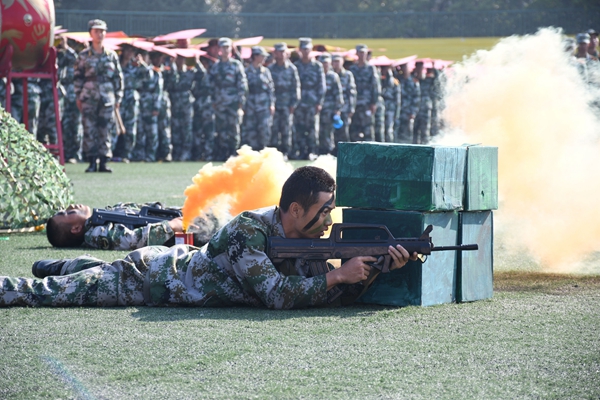 分列式表演结束后,四面鼓声有节奏的响起,主席台上一名教官摇着一面红旗发出开始的号令,本次军训汇演最大的亮点拳术表演以及战术表演相继上演。jdb电子官网200名新生和其他学院200名新生共同组成的400人拳术队站在田径场正中间,挥出拳头,迈开步伐,开始了军体拳表演。拳如风、步如松,他们动作刚劲、拳脚有力、气势十足、口号浑厚响亮,一套军体拳打出了军人的气势,磅礴的架势。随着豪迈的音乐响起,烟雾弹的烟雾笼罩着田径场中部,一场由军训团教官带来的战术表演在田径场中激烈进行着,战术表演模拟了战场实景、进攻战术与战场救护等科目,现场掌声欢呼声不绝于耳。