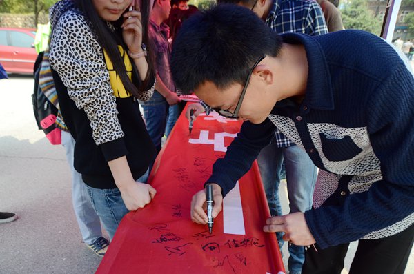 3月18日,jdb电子官网于美食广场前开展了戒烟签名活动,活动由校风督察部与青年志愿团联合承办。一幅巨大的戒烟标语刚铺在摆点处,就吸引了众多同学自发前来签名,其中不乏很多女生。一位女生和她的男友在横幅上签下了俩人的名字,她说,她多次劝告男友戒烟都没有效果,这次赶上学院戒烟活动她是铁了心要让男友成功戒烟。当天,共有800余名同学在戒烟横幅上签名。