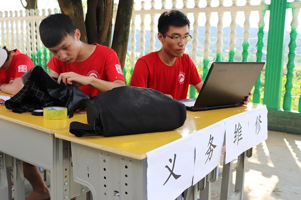 “我们家灯坏了很久,不知道能不能修?”一位老爷爷问道,志愿者赶紧迎上去,扶老爷爷坐下,随后对坏掉的灯进行了检查与维修,老爷爷看着亮起的灯泡,对他们表示了的感谢。即使早已汗流浃背,也冲刷不了志愿者们的热情,他们的敬业赢得了村民们的赞扬。